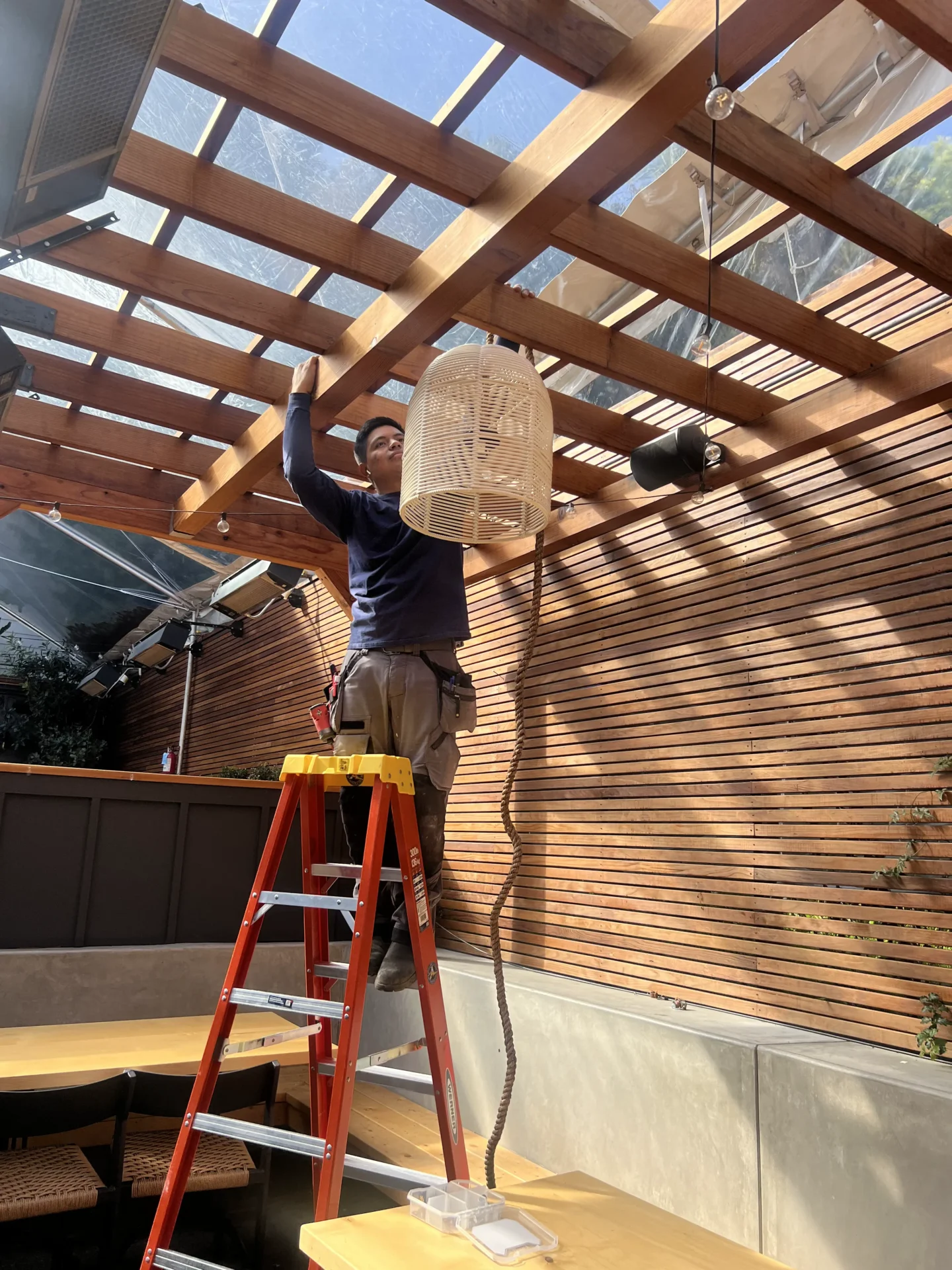 Outdoor seating area with wooden beams, string lights, wicker lamps, and space heaters under a translucent roof, with buildings and a rainy street visible in the background. licensed electrician san francisco